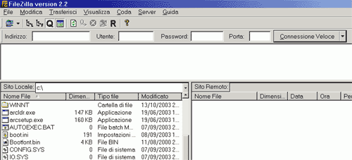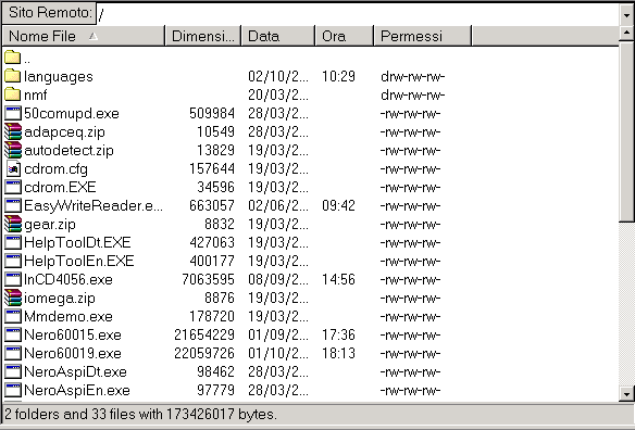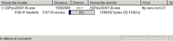 Noterete subito in alto le caselle "Indirizzo", "Utente", "Password" e "Porta", queste sono utilissime per una connessione veloce ad un server, un esempio? Presto detto, ammettiamo di voler scaricare l'ultimo aggiornamento di Nero ma di non voler visitare il sito, colleghiamoci all'FTP di Nero: scriviamo a fianco ad "Indirizzo:" il dns del server che è ftp.nero.com e lasciamo gli altri campi vuoti; vi starete chiedendo perché vuoti? Utente e Password sono inutili perché effettueremo una connessione anonima (il che significa che non abbisogna di nome utnte) al server mentre la porta essendo quella di default (21) verrà inserita automaticamente dal programma. Ora siamo connessi all'FTP ed a metà pagina del programma troviamo due colonne, la sinistra indica i file sul vostro computer, quella a destra i file sul server; eccovene un'immagine ora possiamo scegliere il file che più ci interessa e scaricare e cliccando due volte sul nome del file avvieremo il download che possiamo tener d'occhio nello spazio in basso del programma come potete vedere nel seguente screenshot una
